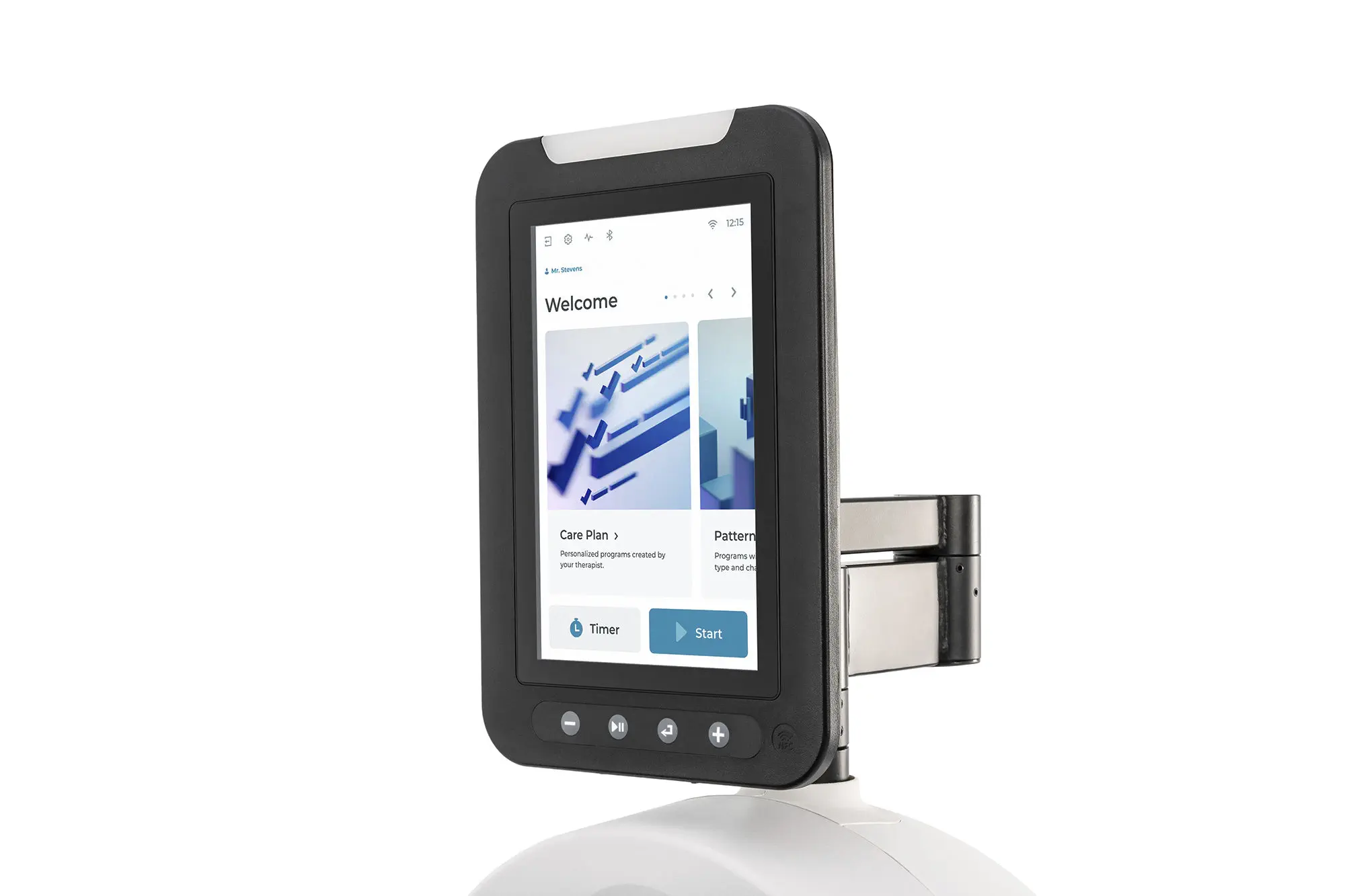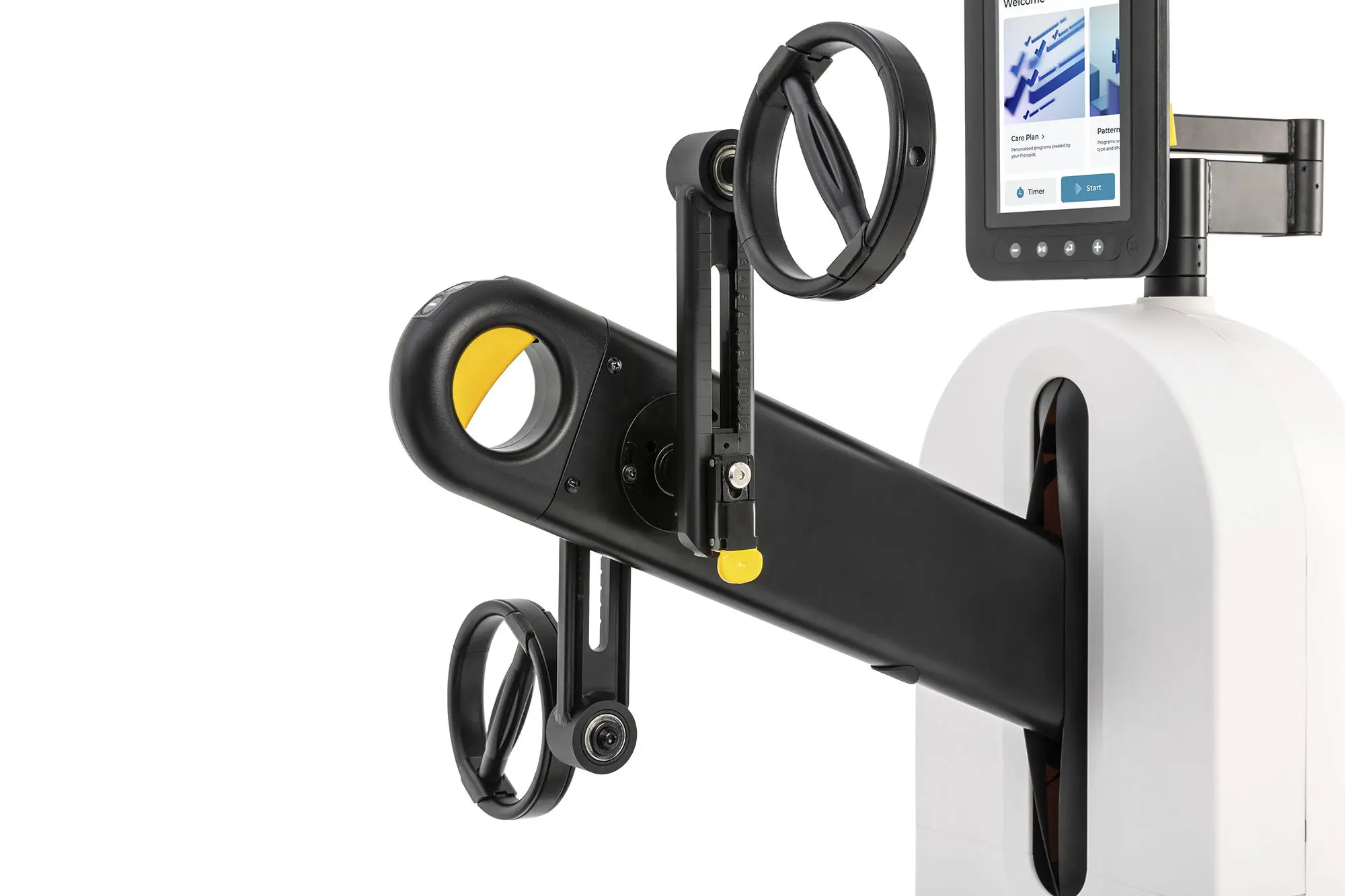 Analyse de la répartition de l’effort : visualisation de la puissance de rotation des pédales sur l’ensemble de la trajectoire – évaluation précise de l’engagement musculaire. - Ergonomie universelle : poignées anatomiques rotatives réduisant la charge sur les articulations, siège amovible pour un accès facile aux patients en fauteuil roulant. Hauteur des poignées et de l’écran réglable selon la taille du patient.